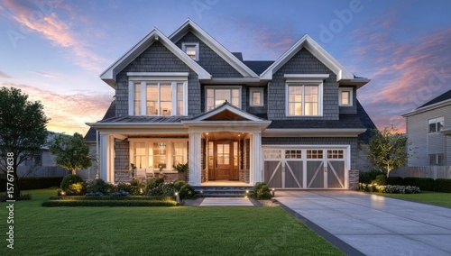© Texture, Obraz premium Two-story house with gray siding, white trim, and a covered porch, illuminated at dusk. Landscaped lawn and driveway