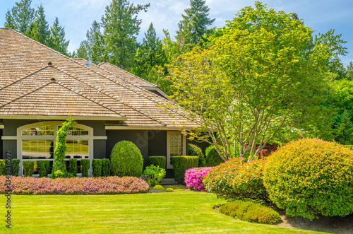Fototapeta premium Two story luxury house with beautiful summer landscape in Vancouver, Canada,...