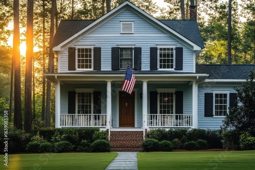 © app, Obraz premium Two-story white house with black shutters and porch surrounded by green shrubs and tall pine trees at sunset with an American flag hanging by the front door