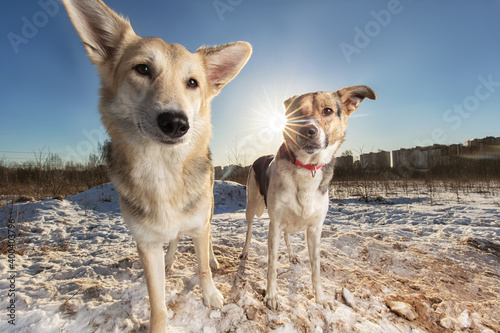 © Alexandr, Naklejka premium Two Strong healthy mongrel dogs in winter field