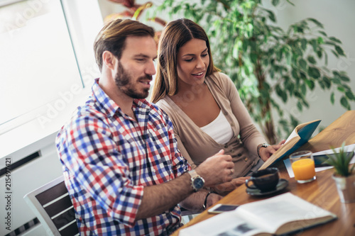 © Mediteraneo, Obraz premium Two students doing homework together and helping each other sitting in a table at home with a homey background