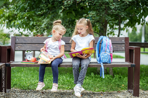 Fototapeta premium Two students read books after classes. The concept of school, study, education, friendship, childhood.