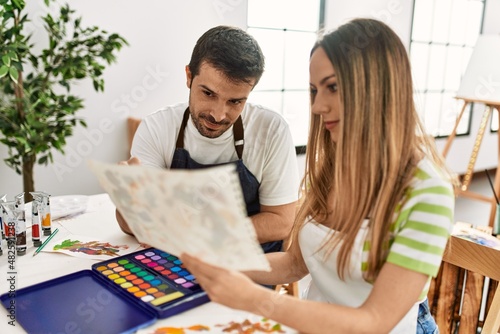 Obraz premium Two students smiling happy painting sitting on the table at art school.