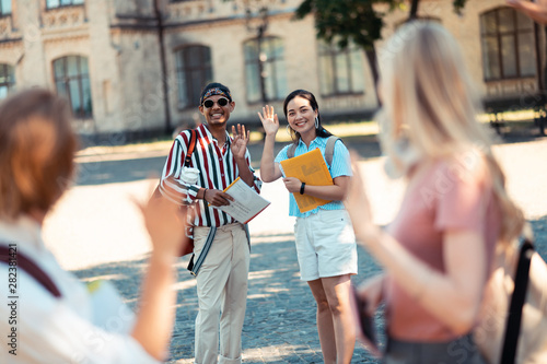 Obraz premium Two students waving hands to their groupmates in the front.