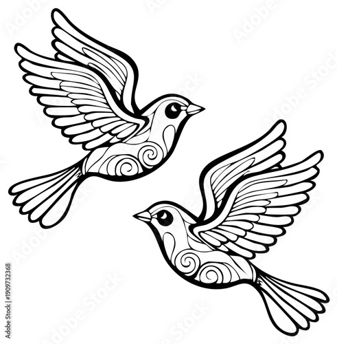 Fototapeta premium Two stylized birds with ornate feather patterns flying with wings spread