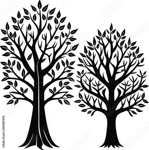© Vector Stock, Obraz premium Two stylized black silhouette trees with detailed branching patterns and leafy canopies against a white background