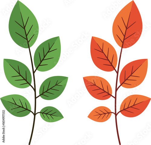 © Your Vectors, Obraz premium Two stylized branches with vibrant green leaves on one and warm orange and red autumn leaves on the other isolated on white