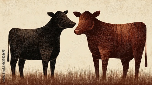 Fototapeta premium Two Stylized Cows in a Field: Rustic Farm Animal Illustration for Decor and...