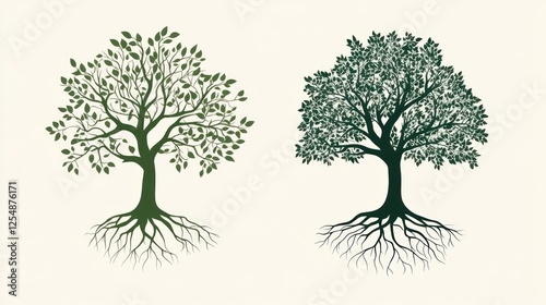 Obraz premium Two stylized trees, roots visible, nature illustration, design element