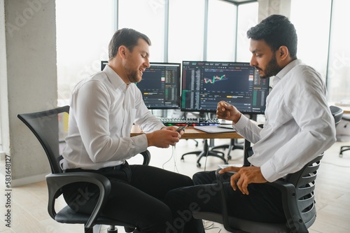 © Serhii, Fototapeta premium Two successful trader in formalwear pointing at display, analyzing stat and dynamic on forex charts, working in office together