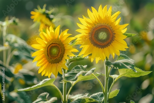 Fototapeta premium Two sunflowers are growing tall and blooming in a cultivated field