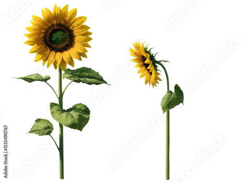 Naklejka premium Two sunflowers in full bloom, with golden yellow petals against a solid backdrop