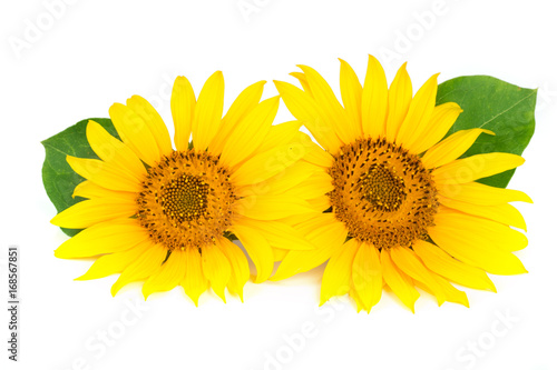 Fototapeta premium Two sunflowers with leaves isolated on white background