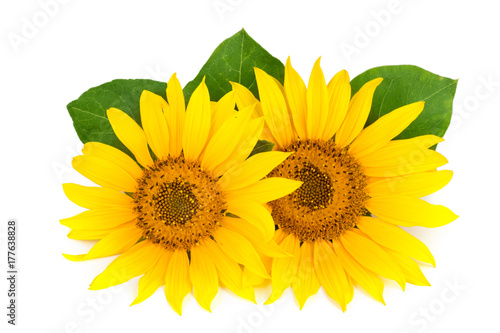 Fototapeta premium Two sunflowers with leaves isolated on white background