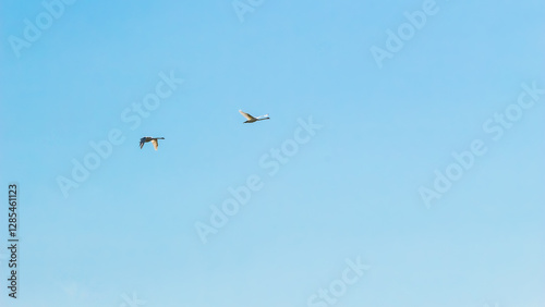 © Chmutphoto, Obraz premium Two swans flying in clear blue sky
