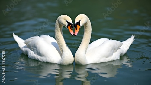 © goslim, Fototapeta premium Two Swans in a HeartShaped Embrace on a Still Pond