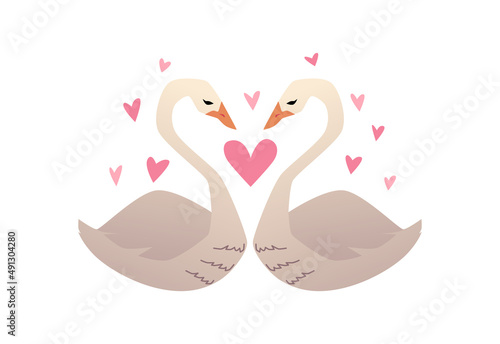 © sabelskaya, Fototapeta premium Two swans in love, heads in shape of heart - cartoon flat vector illustration isolated on white background.