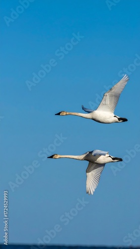 © Fatan, Fototapeta premium Two swans soaring in a vibrant blue sky