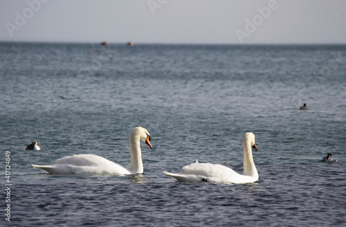 Fototapeta premium Two swans swim beautifully on the sea water.