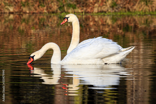 © Beautyness, Fototapeta premium two swans swimming at sunrise at skylakes Plothen, Germany