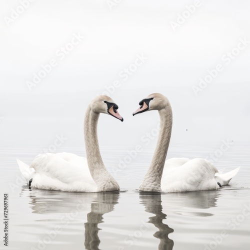 © GoldenART, Fototapeta premium two swans swimming in the lake on a misty day.