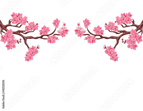 Fototapeta premium Two symmetrical branches with pink cherry blossoms. Sakura. Isolated on white background. illustration
