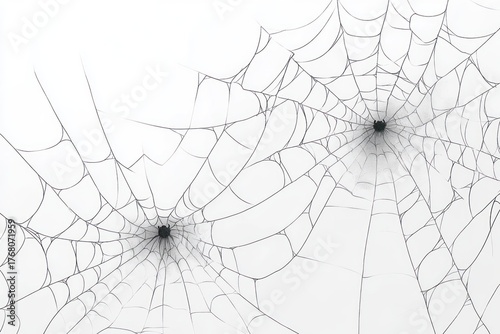 © smartcat, Obraz premium Two symmetrical spider webs with spiders positioned at their centers against a white background, showcasing intricate web patterns and delicate lines