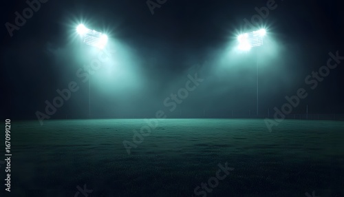 Fototapeta premium Two tall stadium lights illuminate an empty, dark sports field covered in...
