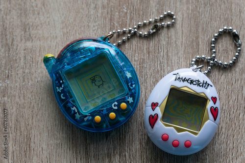 Naklejka premium Two Tamagotchi Virtual Pets on the table