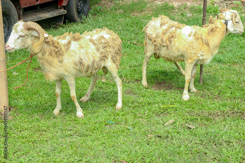 © Rans photography, Obraz premium Two Tan Sheep Standing on Green Grass in Rural Setting