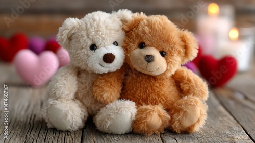© Sarfan, Obraz premium Two teddy bears hug on rustic wood surrounded by love hearts and candles