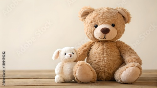 © MIkrom, Obraz premium Two Teddy Bears One Large Brown One Small White Sitting on Wooden Surface With Soft Background
