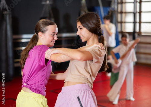 Fototapeta premium Two teenage girls training self-defense techniques in pairs in studio
