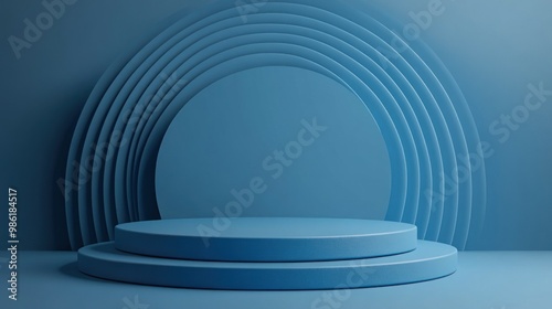 Obraz premium Two-tiered blue platform with abstract circle backdrop.