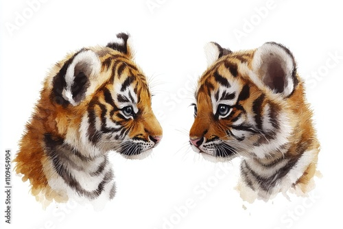 © Geraldine, Fototapeta premium Two tiger cubs face each other, showcasing their playful expressions in a watercolor style.