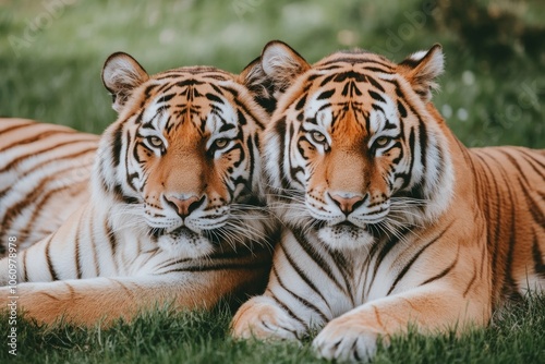 © Natalia, Fototapeta premium Two tigers resting close together in a grassy field during warm afternoon light showcasing their stripes