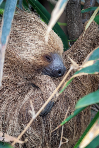 Fototapeta premium Two-toed sloth sleeping in a tree, vertical format