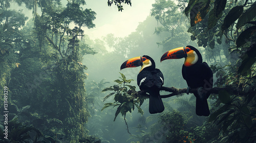 Fototapeta premium Two toucans perched in lush jungle setting, surrounded by dense foliage