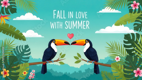 © GfxAkash, Fototapeta premium Two toucans perched on a branch in a lush tropical jungle kissing under a summer sky