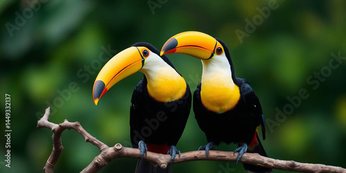 © Sarfraz, Naklejka premium two toucans perched on a twisted branch against a blurred green background