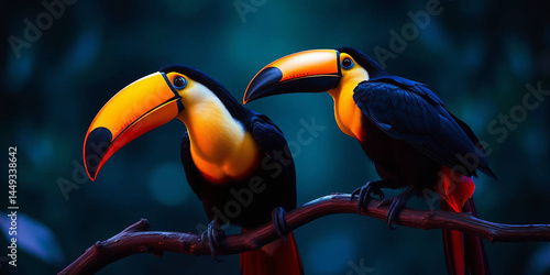 © Sarfraz, Naklejka premium two toucans perched on a twisted branch against a blurred green background