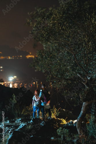 Obraz premium Two tourists on top of the mountain. Climbing, hiking trail. View of the night city. Romantic setting. Couple in love. Active lifestyle. The best view. vertical photo. Vacation. Nerano, Italy