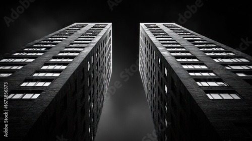 © RONNY, Obraz premium Two towering skyscrapers ascend, black and white