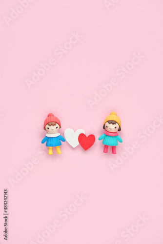© Ju_see, Fototapeta premium two toy dolls with red and white hearts on pink background. cute toy friends with hearts. 14 february, Valentine's day, Love, romance, friendship concept. flat lay. copy space