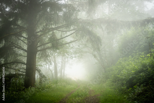 Fototapeta premium Two Track Trail Disappears Into The Fog And Overhanging Trees