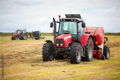 © Alexey Zarodov, Obraz premium two tractors collecting haystack in the field