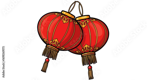© Maryati, Obraz premium Two Traditional Chinese Paper Lanterns Red and Gold Decorated.