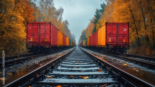 Fototapeta premium Two trains are on the tracks, one red and one yellow