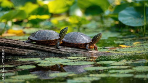 © netsay, Fototapeta premium Two Tranquil Turtles Basking on a Log Amidst a Serene Pond Backdrop Perfect for RelaxationFocused Projects, Social Media Campaigns and Website Banners.