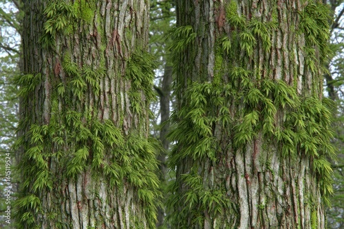 © Aupa, Obraz premium Two tree trunks covered in vibrant green moss